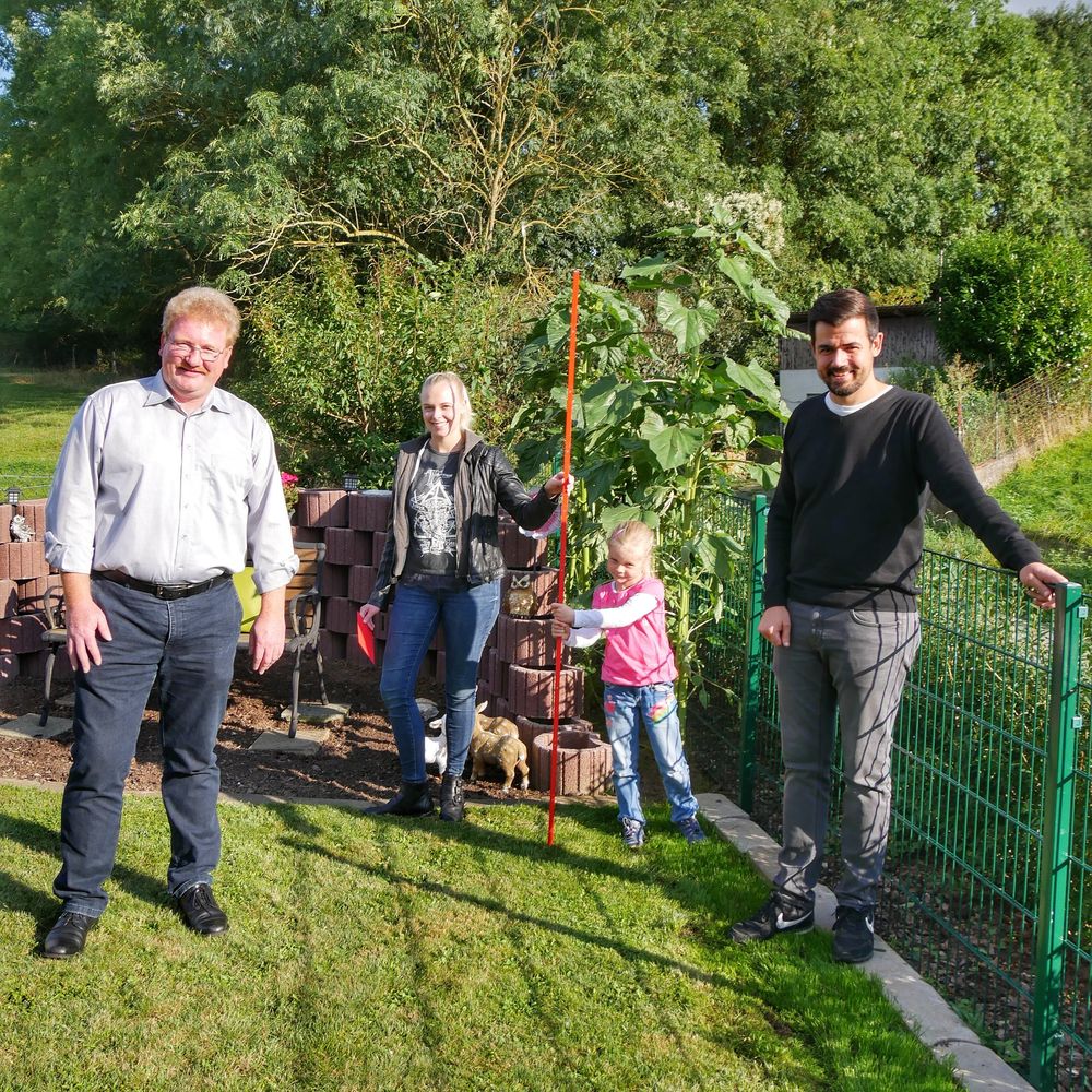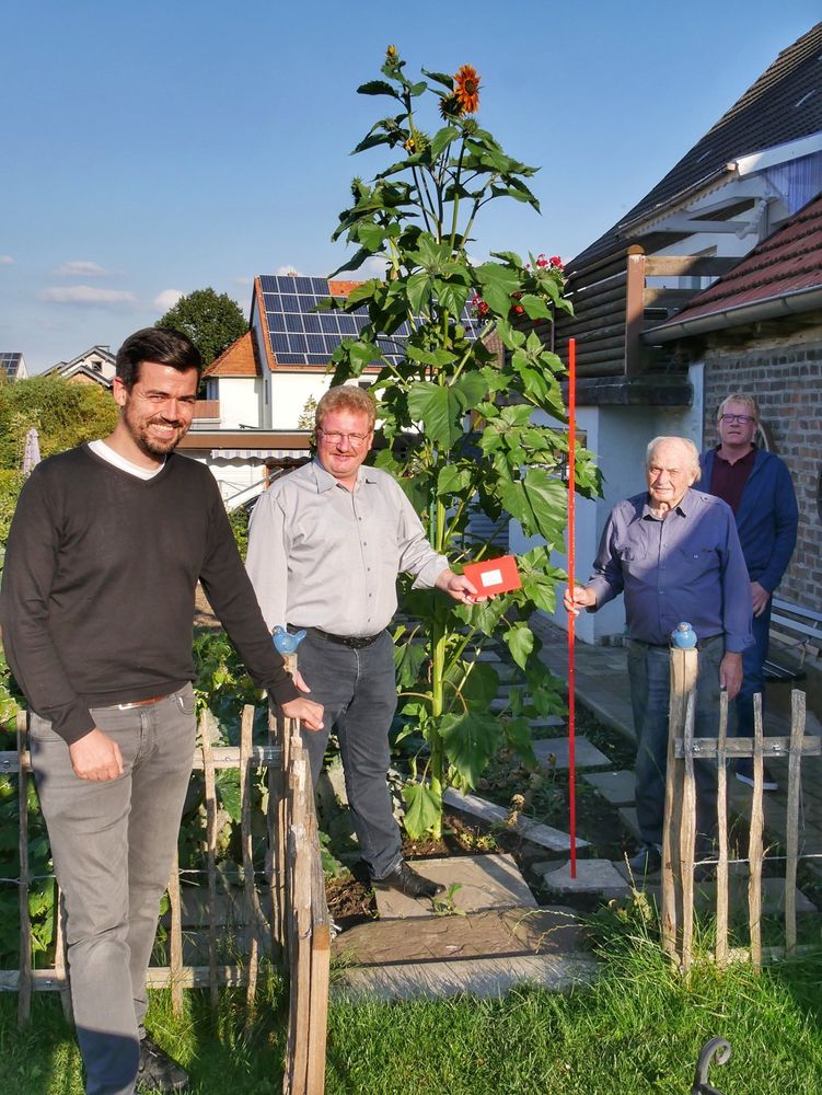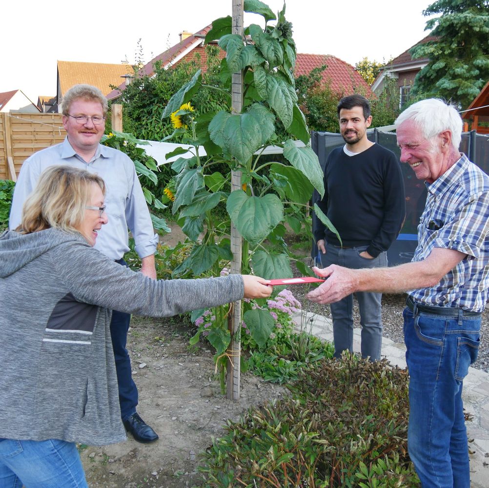 „Ich habe etwas Naturdünger dazu gegeben und immer gut gegossen“, verrät Karl Koch schmunzelnd das Geheimnis seines Erfolgs. Und neben dem guten Boden hatte er für die Sonnenblume auch einen besonders sonnigen Standort ausgesucht. Das machte sich bezahlt: Am Montag konnte er einen Einkaufsgutschein über 50 Euro aus den Händen von Bürgermeisterkandidat Hubertus Herbold entgegennehmen.